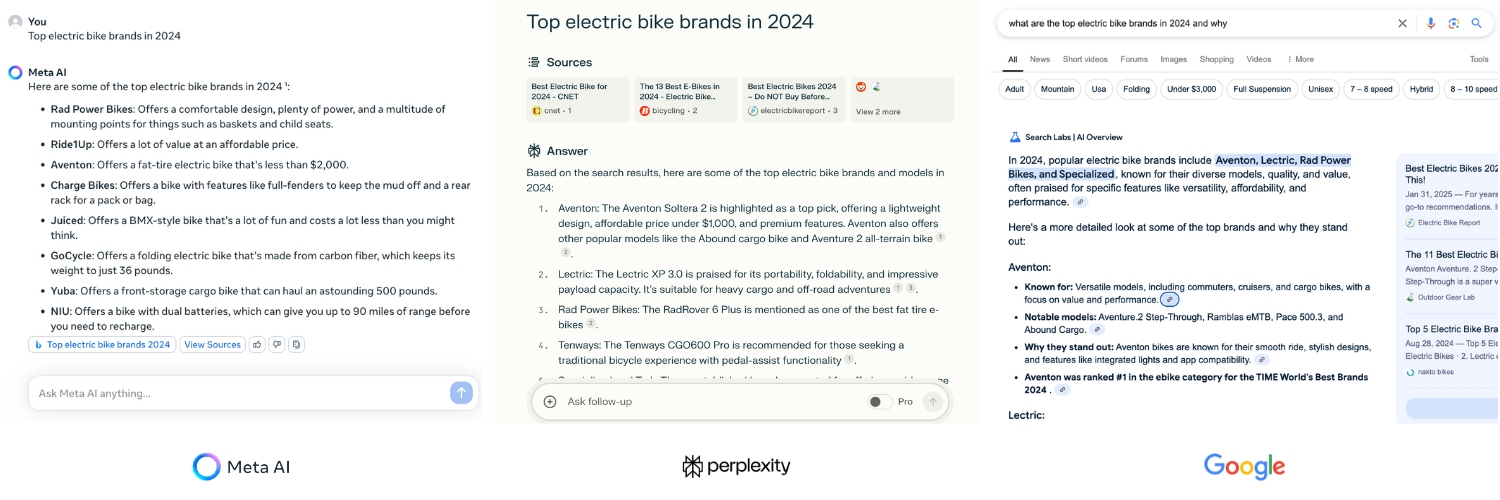 We asked Perplexity, Meta, and Google about the top electric bike brands in 2024. This example is somewhat anecdotal, but it does illustrate some of the high-level similarities and differences between the three programs.